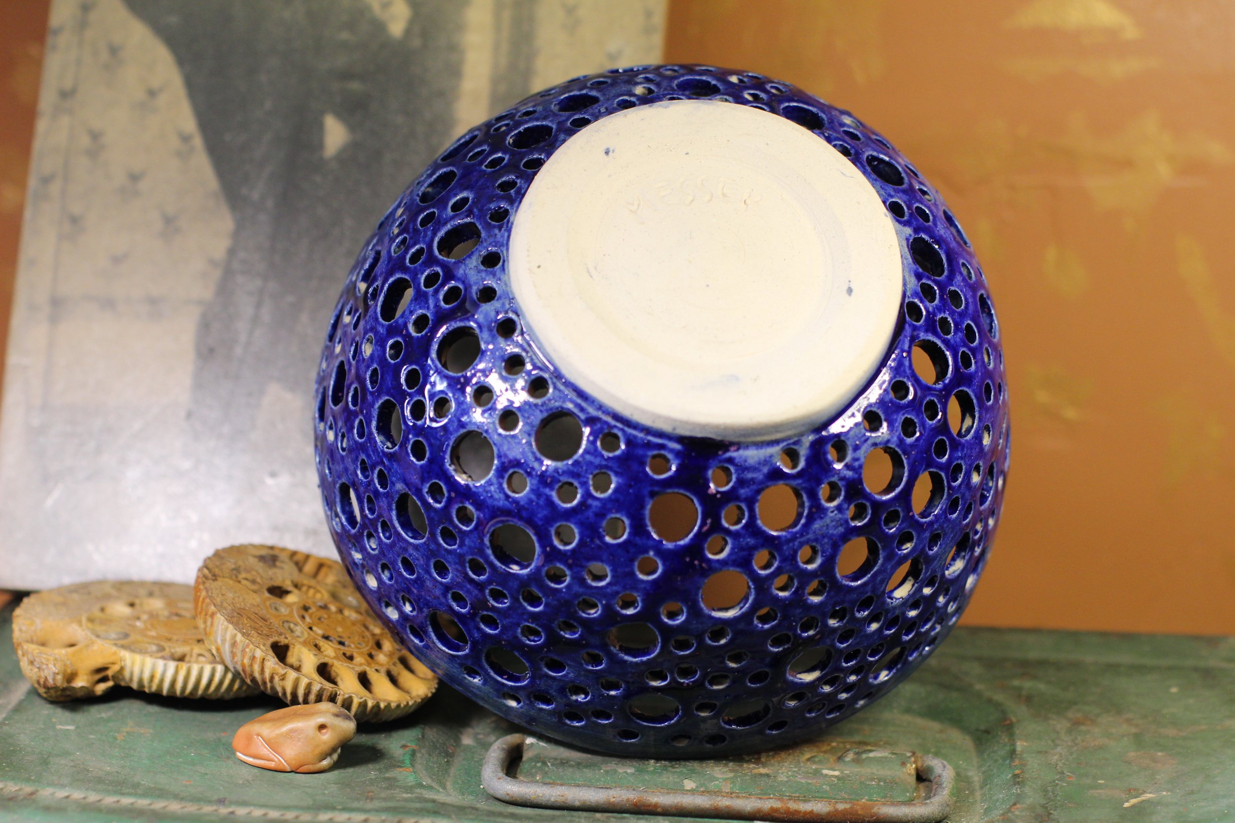 A light stoneware berry bowl glazed in a bright blue. This bowl has many holes of two different sizes randomly arranged around the bowl. Berry bowls are basically whimsical colanders designed specifically for rinsing and serving berries. Signed “MESSER”