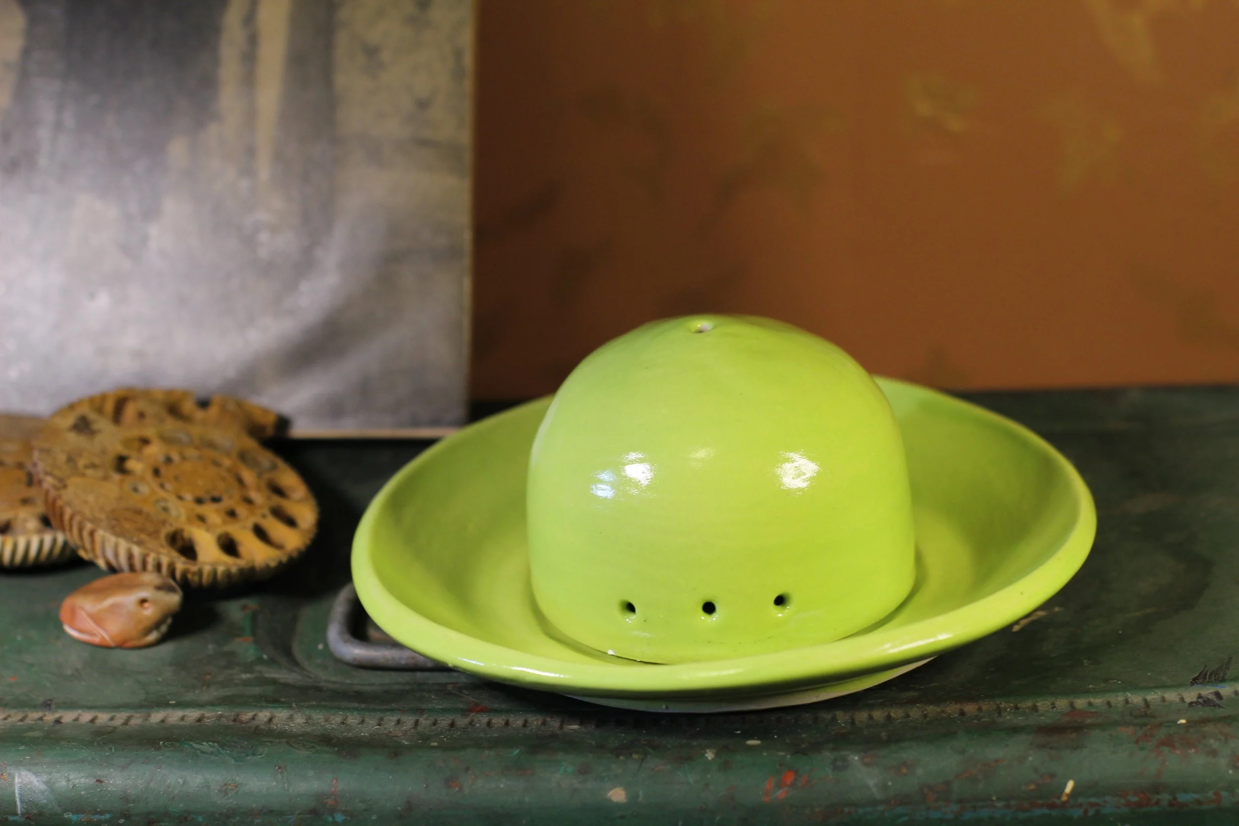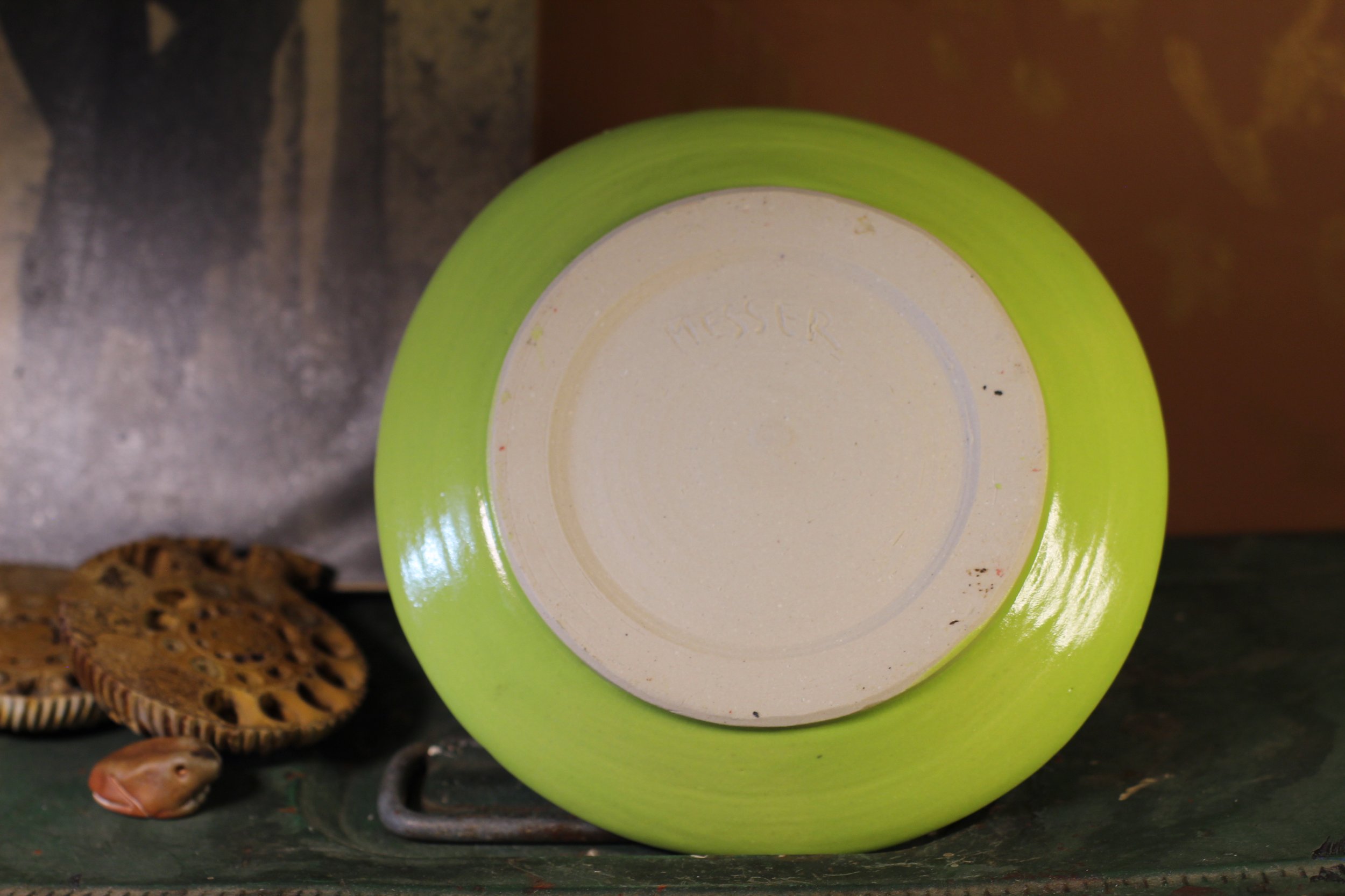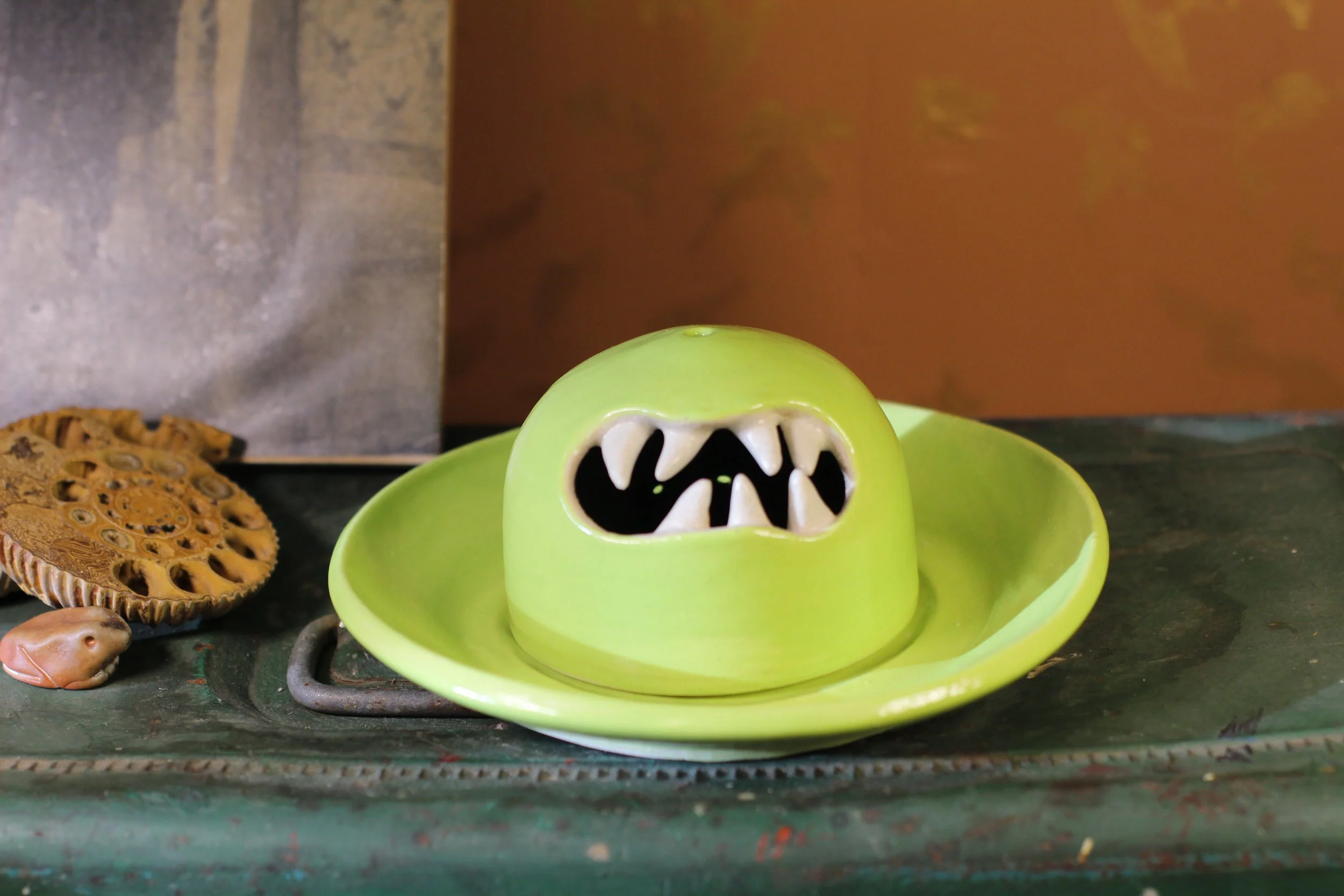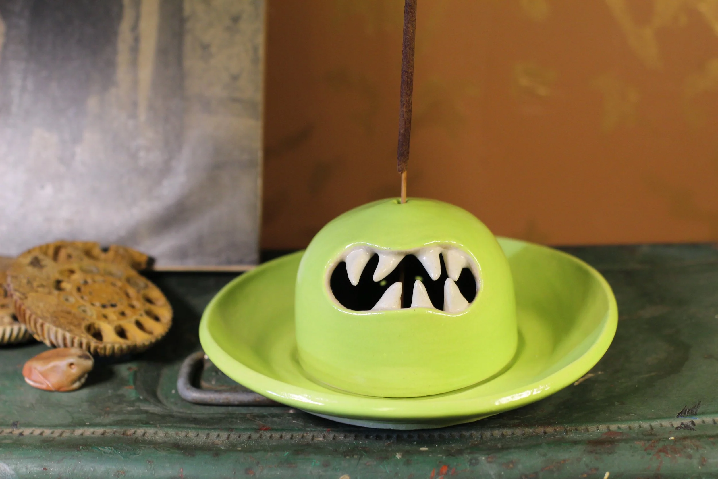 A light stoneware monster incense holder glazed in a bright green that is designed to hold both cone and stick incense. The mouth and holes on the back of the “head” allow for enough airflow for the cone incense. There is a hole in the top of the “head” and an indent in the center of the ash-catching plate to keep your stick incense standing straight up. Signed “MESSER”