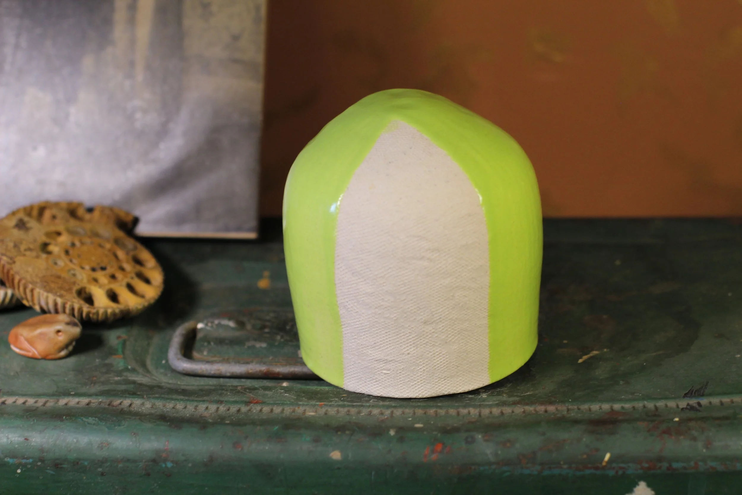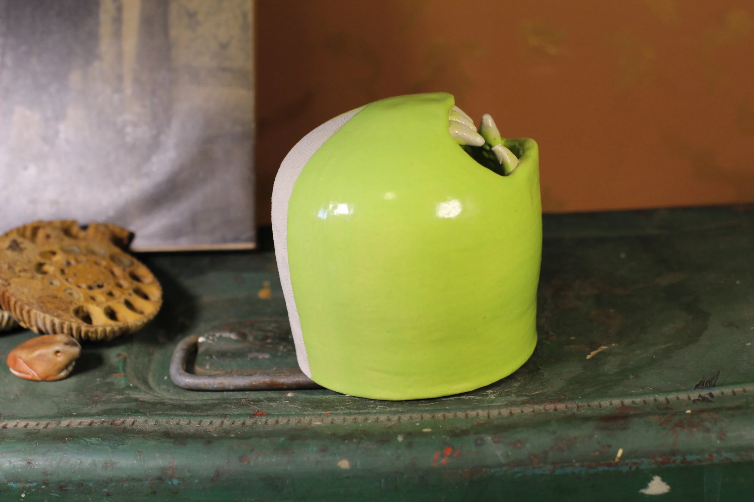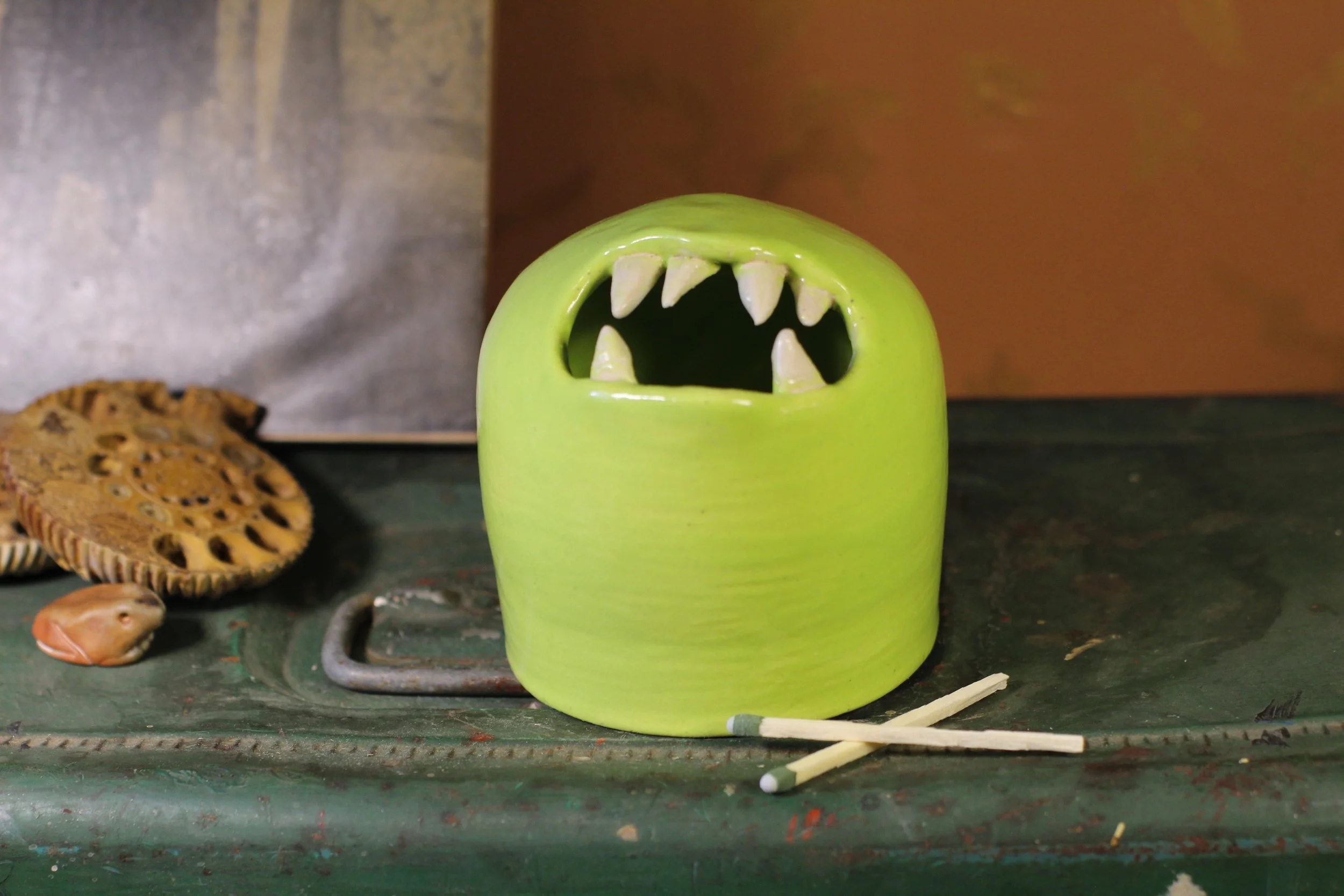A light, speckled stoneware monster glazed in a bright green that features a textured area on the back for striking your matches. Unused matches can be stored in the monster’s mouth for future use, or you can dispose of used matches by “feeding” your monster. Pick your poison. Signed “MESSER”